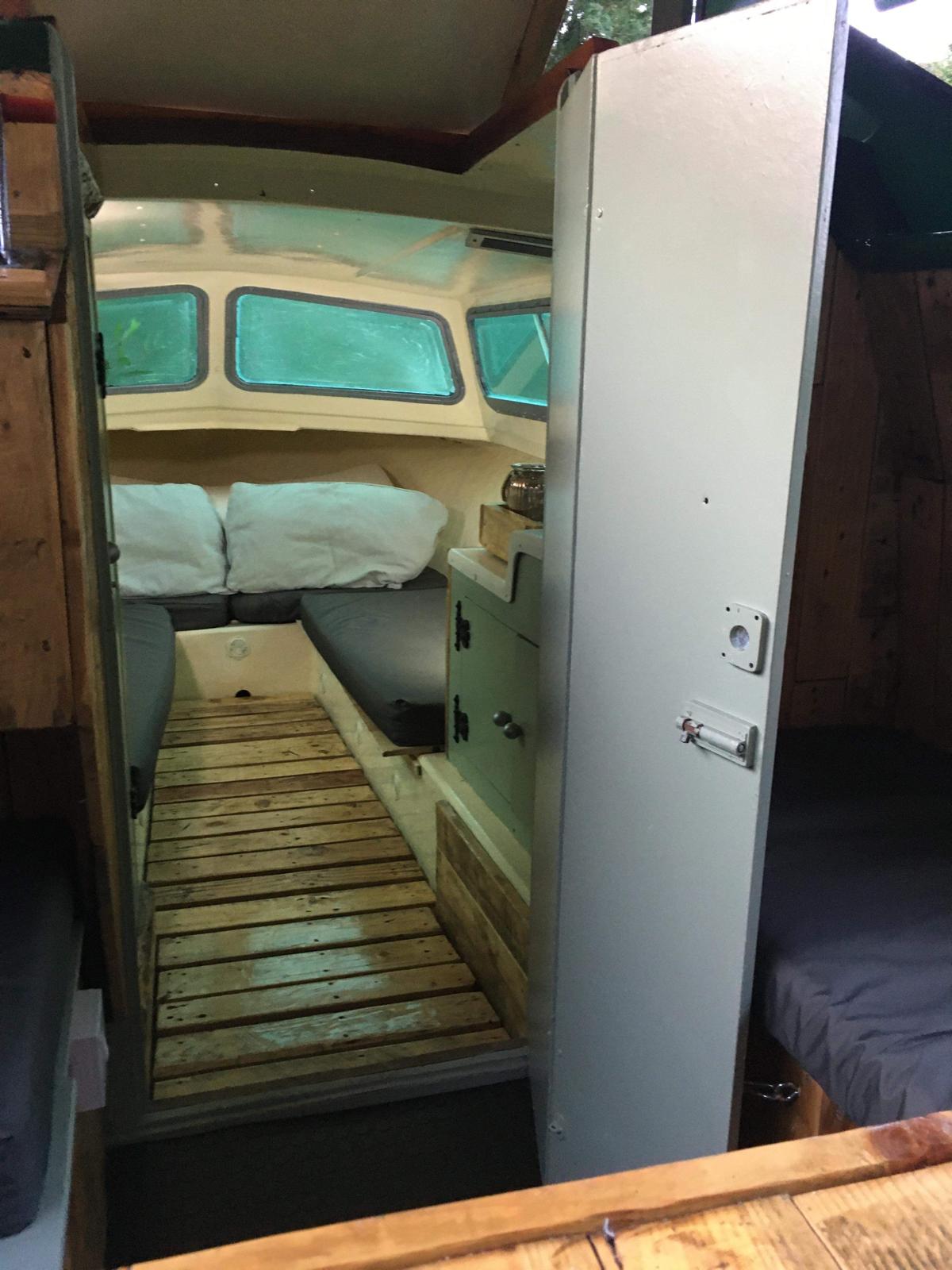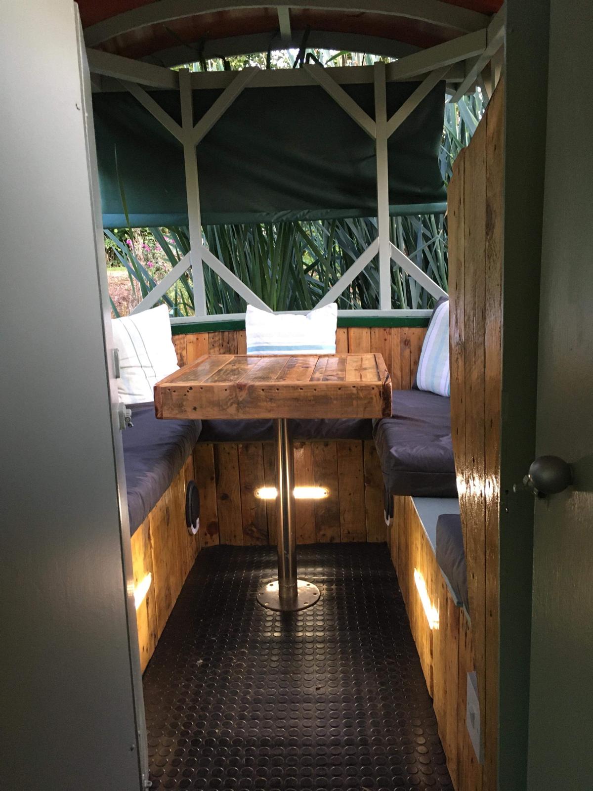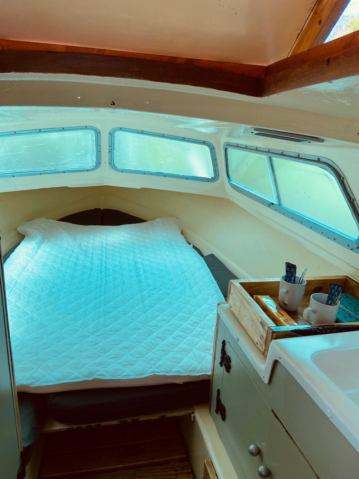 On board you’ll find a comfortable seating area with 12v phone chargers. If you prefer to stretch your land legs, there’s an outdoor space for food preparation with a fully equipped camper’s kitchen — everything you need to prepare a simple meal or a hot drink.