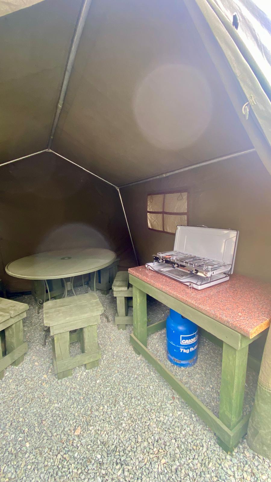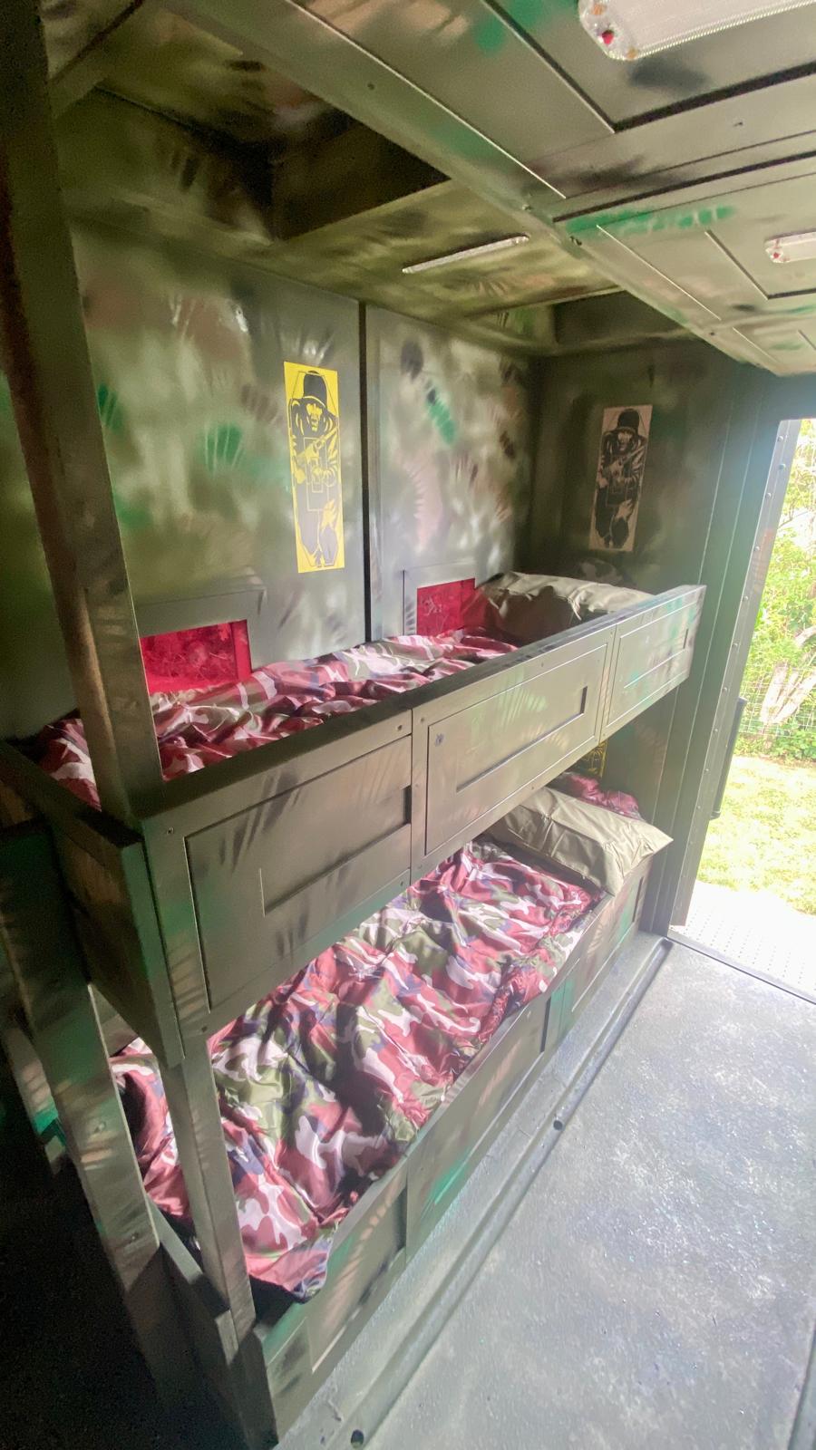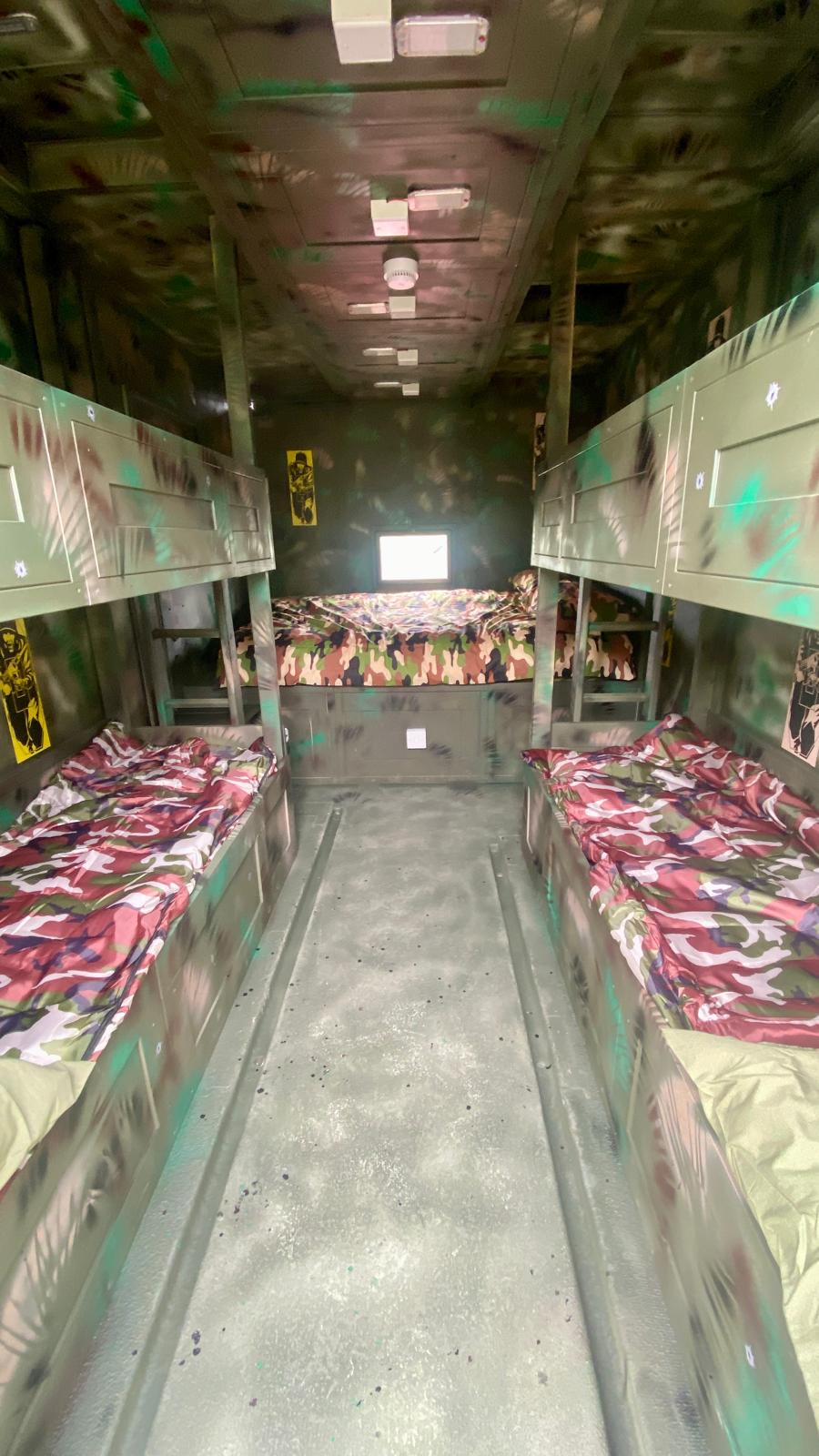 Inside, you’ll find bold commando styling and cosy comforts, while outside there’s a dedicated seating area for downtime after a day on manoeuvres. A unique camping-cooking station set within a military tent adds to the full boot-camp experience — ideal for rustling up rations and plotting the next mission.